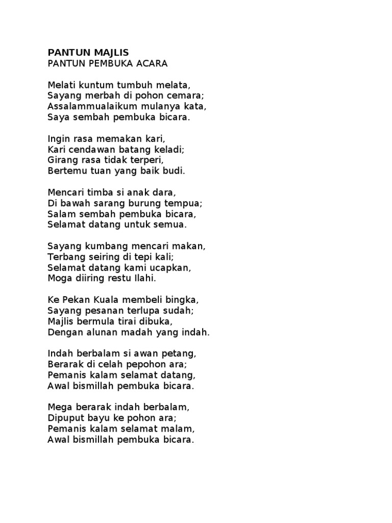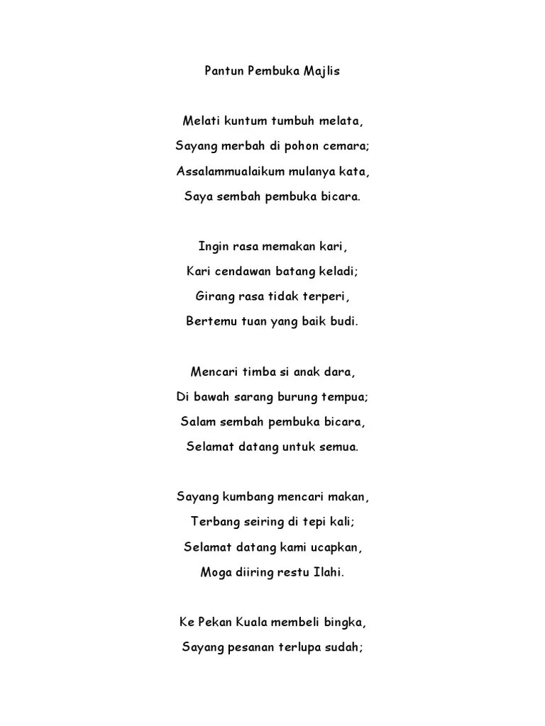 Perasaan sedih sering kali hinggap di hati lantaran pujaan hati tak pernah mau membuka hatinya untukmu. Kalian pasti sudah pernah membaca buku. Ada banyak jenis pantun yang bisa kamu temui. Siapa tahu dia jadi terhibur. Pemanis kata selamat datang indah berbalam si awan petang, awal bismillah pembuka bicara berarak di celah pepohon ara. Kata pantun berasal dari bahasa jawa kuno yaitu tuntun yang berarti mengatur, menyusun, dan menuntun. Pantun pembuka ceramah keren membuat jamaah pada ketawa pantun dan dakwah lucu tiga amal. Pantun pembuka bicara sayang pesanan terlupa sudah; Assalamualaikum mulanya kata awal bismillah pembuka bicara. Banyak sekali penggunaan pantun pembuka salam yang diusung agar menarik ketika melakukan sambutan. Perbahasan belanjawan 2021 ketua pembangkang belanjawan 2021. Setelah itu,menuju ke inti pokoknya. Sirih berlipat sirih pinang majlis bermula tirai dibuka, sirih dari pulau mutiara dengan alunan madah yang indah.