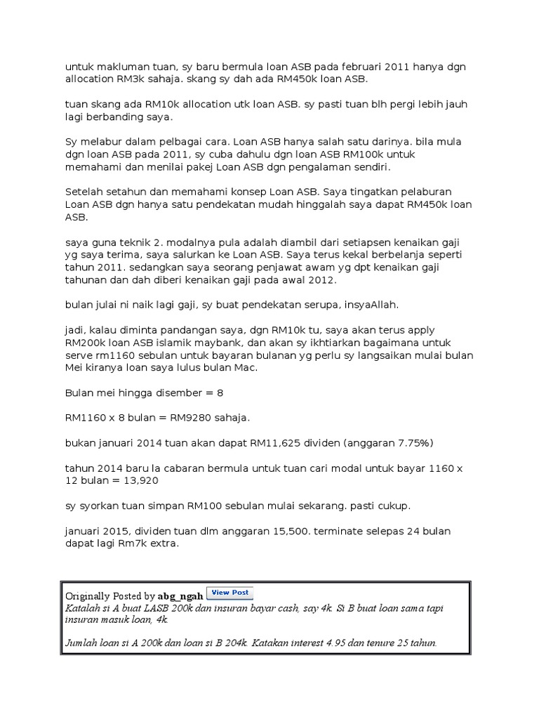 Even maybank staff mentioned that they can waive the insurance requirement. Pembayaran bermula feb 2010 sampai la sekarang untuk 25 tahun. Maklumkan bahawa anda ingin tutup akaun asb loan anda. So skrg sy nk thu, brapa jmlah akan sy dpt ye.? Utk 3 thun stiap kali dividen mmg sy akan byr utk sethun loan tsbut.